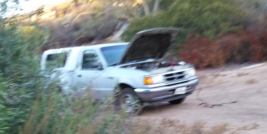 There was an email from WordPress, lesson one of my blogging course, asking, Who am I and what am I doing here? I’m here because I’m bashful. I don’t like striking up conversations with strangers. Fortunately my husband was the one who went out, flagged down the man driving by, and asked if he would give us a jump. I don’t know if I would have been able to do that. The man said he would be back. I thought, How picturesque, a truck on a lonely dirt road with its hood open and jumper cables hanging out. No sooner had I snapped the picture than the man was back to give us a jump.