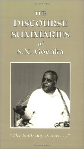 On day one of the ten-day meditation workshop taught by S.N. Goenka via prerecorded audios and videos (as he passed away in 2013), one learns to pay attention to the breath, not a mantra, not a name of God, not an external object as these things might be sectarian, and misery is universal. The steps to liberation from misery are available to all. One sits in one’s assigned place on a meditation cushion and mat on the floor of the meditation hall, or in a chair (if one prefers), and meditates, three or more hours during that first day, and puts one’’s full attention on the ingress and egress of one’’s breath through the nostrils. The Discourse Summaries; is a book of summaries of transcripts of the eleven talks given by Goenka for ten evenings and one (the last) morning, during two of the 10-day Vipassana meditation retreats that he personally led in 1983 and 1984.