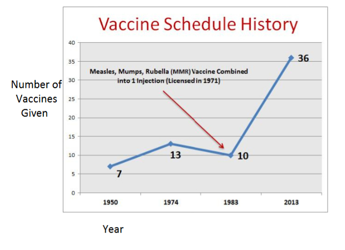 The number of doses per infant or child has been steadily amped up. Today’s children receive many times more than we did in the fifties. The combined, or synergistic, effect of all these doses has never been tested.
