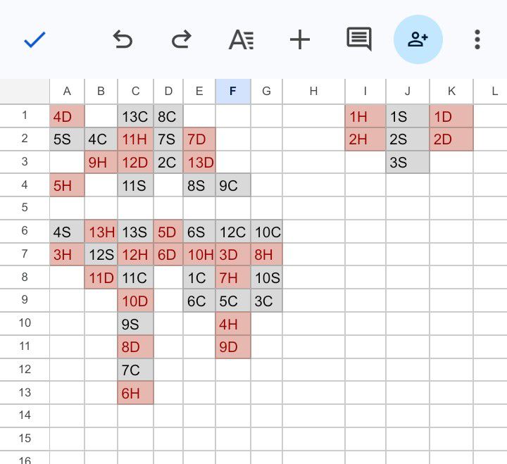 Order the tokens in ascending numerical order in one column, per each of D, H, C, and S suits in columns I through L, starting with 1. The player may not place a piece in this area, other than a 1, unless the previous number of that suit has already been placed in the I-L columns.