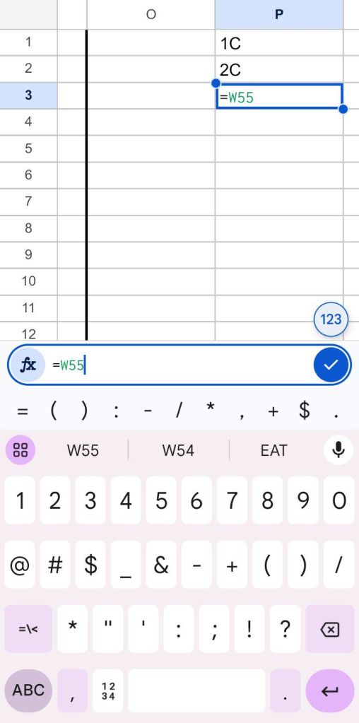Navigate to cell P1, and begin creating the staging area for the game token pattern by typing, =W53 in that cell. Press enter and, 1C, should show in that cell, unless the tokens have been shuffled. Cell P2 should be highlighted, type, =W54 in that cell, then enter.
