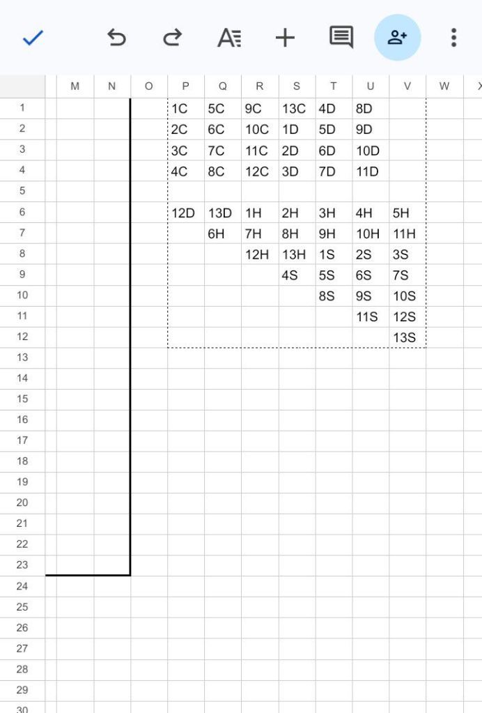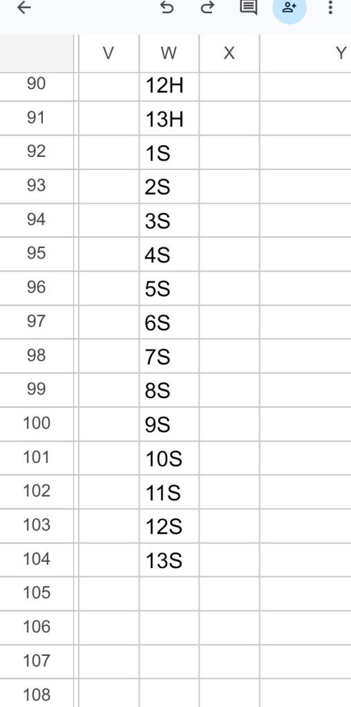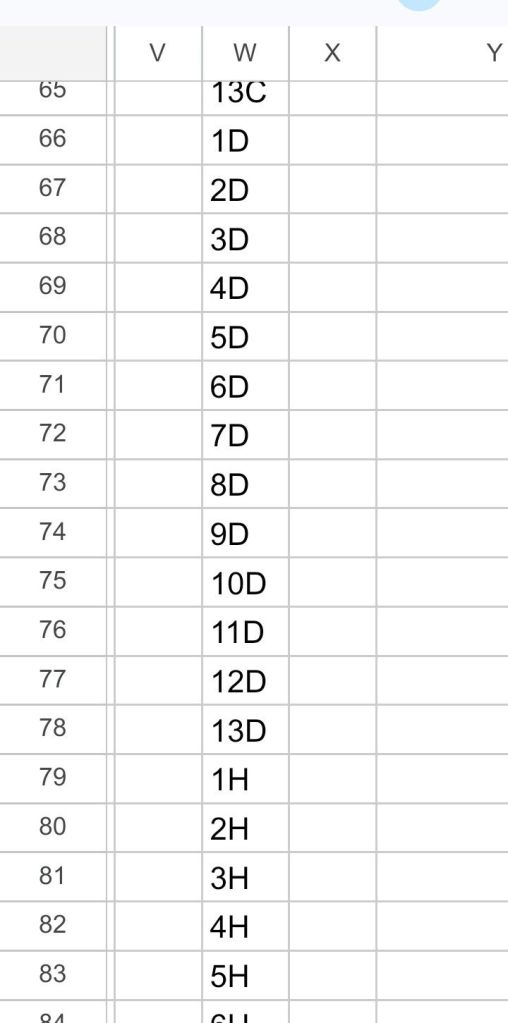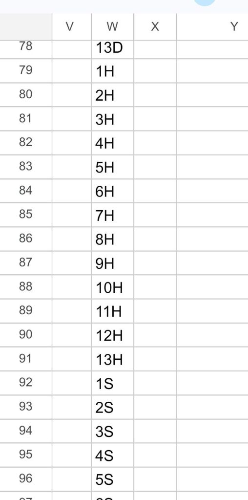 Navigate to cell W53. Type the 52 token names in the consecutive cells of column W. Do not specify colors or backgrounds at this point. (That will be done in a later step.) Type 1C in cell W53, 2C in cell W54, and so on until 13C is in cell W65. Copy cells W53 through W65 , and paste in cell W66, then paste again into cell W79, then a third time into cell W92.