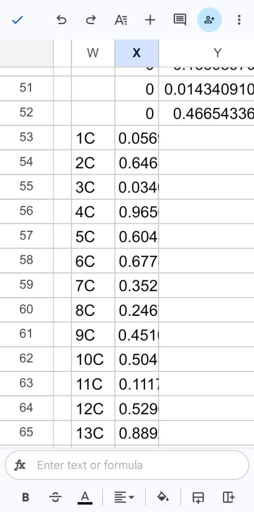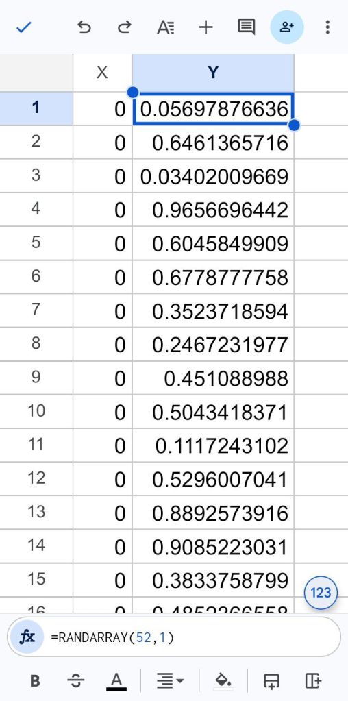 Then copy the random numbers, Y1 through Y52. Tap cell X53 twice and select paste special, and select values only from the menu.