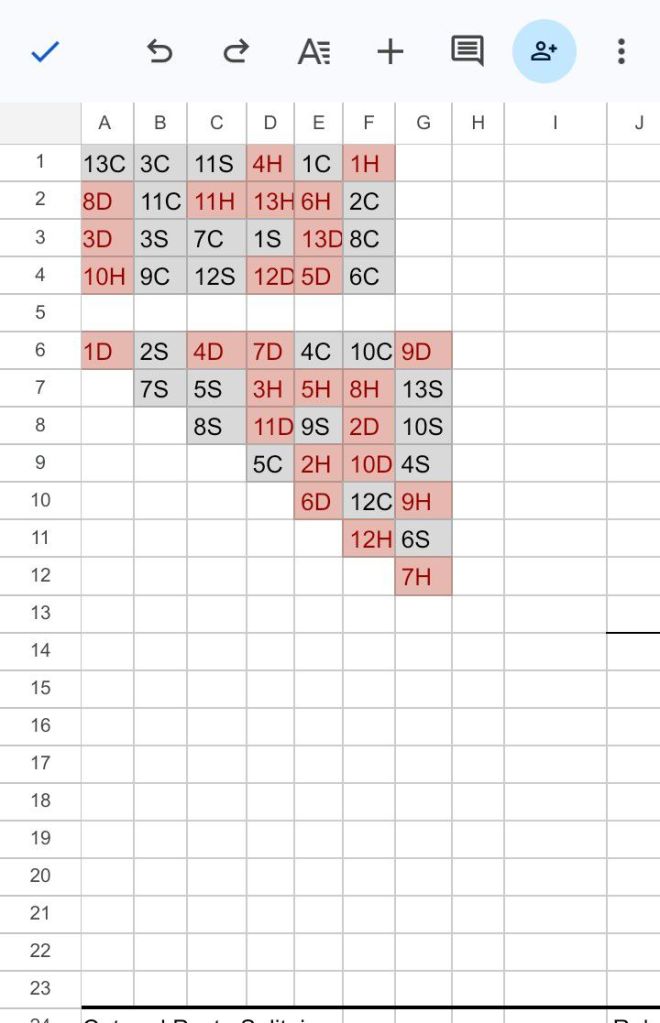 On the top left are available tokens to be used at will (the game began with 24 of them). At the top right is the (in progress) final ordering of 4 categories of 13 tokens each, each category (H, S, D, and C), numbered from 1 through 13. When this is completed (or it is obvious that it can be) the game is “won.” (At the beginning of the game this area was empty.) At the bottom left is the main working pattern of the game. At the beginning this area contained 28 tokens laid out in a triangle, with one token in the left-most column, 2 in the second column from left, 3 in the third, and so on, and 7 in the right-most column. The player can move the token at the bottom of each column, or any portion of a column that has been ordered, if doing so preserves and continues the ordering. The ordering of the lower left section of the game board consists of placing tokens in descending order top to bottom by number, where an alternating pattern of grey and red is maintained. There is no enforcement of rules in this version. Any token can be physically moved anywhere at any time (or tokens can be deleted and created). It is up to the player to follow rules as he or she chooses. Movement of tokens is most easily done by “cut” and “paste.”